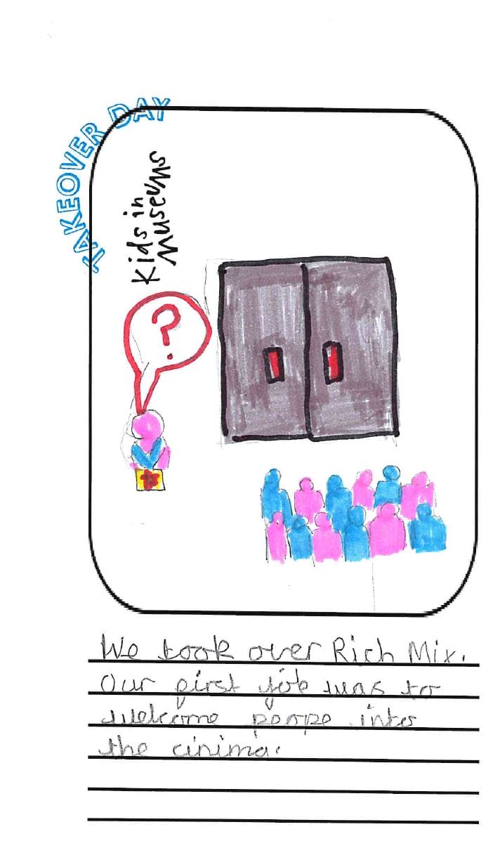 “Arriving punctually, ready in their black work uniform, eager and excited for their day of work at Rich Mix, Thomas Buxton School TAKEOVER staff ceremonially received their badge and lanyard to welcome them as Rich Mix staff! As part of our Pic ‘n’ Mix programme of Film Education and linking into national Kids in Museums Takeover Day we were also excited to have their beaming smiles and energetic personalities as part of our team. A full day of activity taking over everything from welcoming other children and their teachers to a variety of events, making marketing materials, and even helping thread up the projector, lay ahead as they explored behind the screens and scenes at Rich Mix.