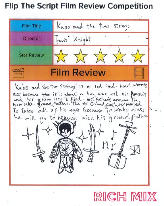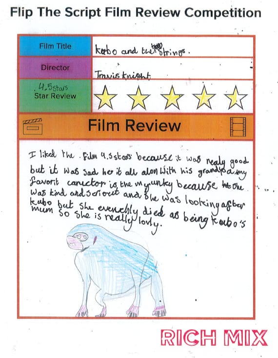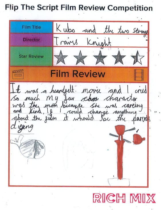 We deliver our free film education screenings as part of our wider film education project, Flip The Script, a year-long primary school programme focusing on diversifying the curriculum and developing visual literacy through film and media skills. To support the students critical thinking, and literacy skills, we invited the students to take part in our film review competition, to be in with a chance of winning free cinema tickets!
