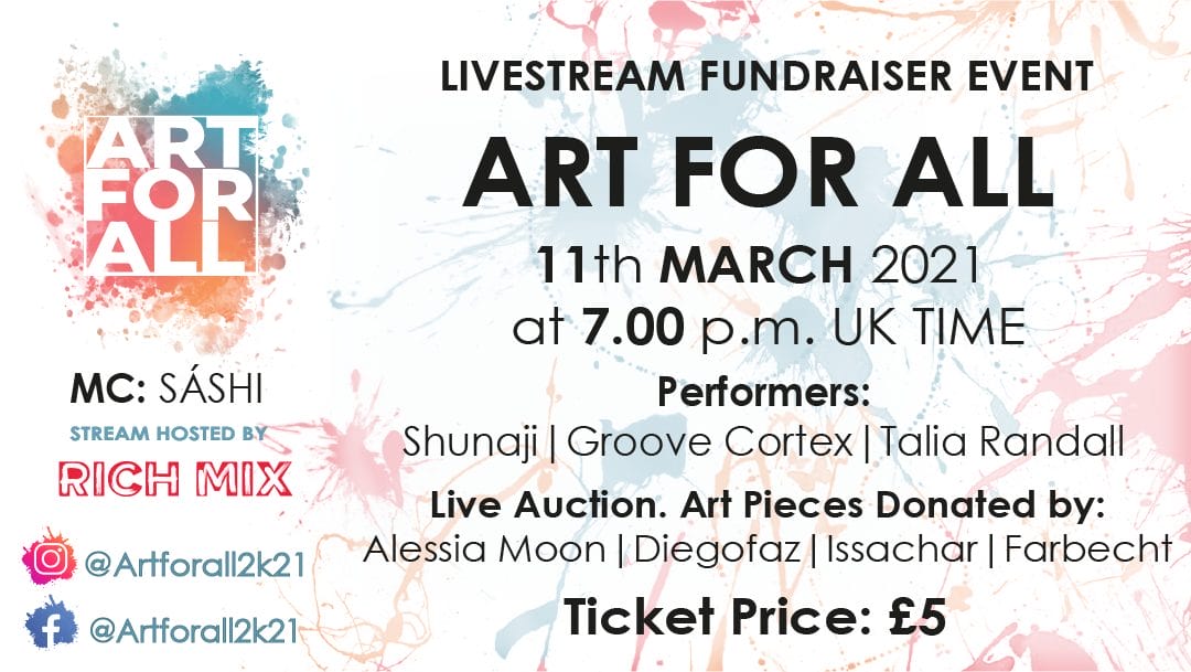 Art For All will be live streamed. The ticket price of £5 will go towards supporting our Take Part programme and you will have the chance to donate throughout the event.